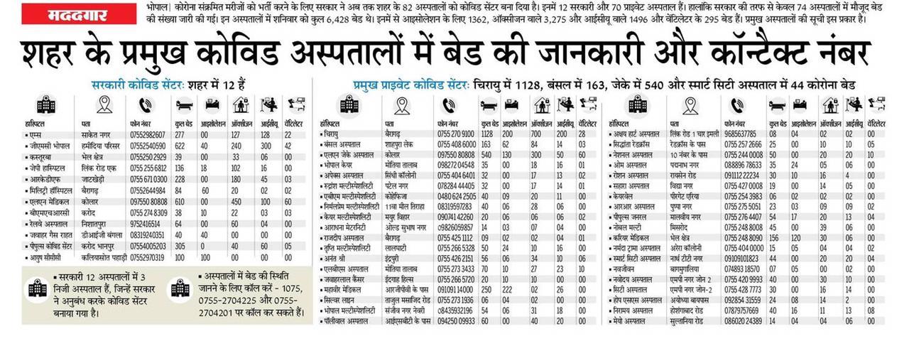 भोपाल के प्रमुख अस्पतालों में बेड की जानकारी