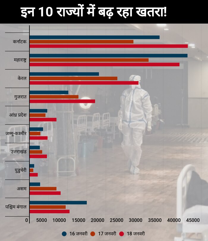 - 24 घंटे में ही कर्नाटक में 14301, महाराष्ट्र में 8096, केरल में 5535, गुजरात में 4366, आंध्र प्रदेश में 2888, जम्मू-कश्मीर में 1824, उत्तराखंड में 1187, पुडुचेरी में 1186, असम में 1090 और पश्चिम बंगाल में 1045 मामले बढ़ गए.