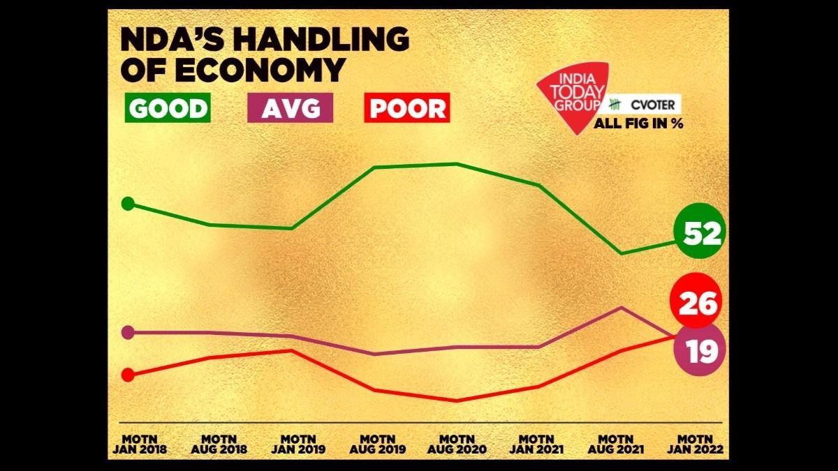सवाल के जरिए जनता का मूड जानने की कोशिश की गई थी, एनडीए सरकार 2018 जनवरी से लेकर जनवरी 2022 तक देश की अर्थव्यवस्था को संभालने में कितनी सक्षम दिखी है. जनता के मुताबिक, 52 प्रतिशत लोगों ने माना कि एनडीए सरकार देश की अर्थव्यवस्था को संभालने में सक्षम दिखी है. वहीं 26 प्रतिशत लोगों ने सरकार के प्रयास को एवरेज बताया है. वहीं 19 फीसदी लोगों का मानना है कि एनडीए सरकार देश की अर्थव्यवस्था को संभालने में नाकाम रही है.