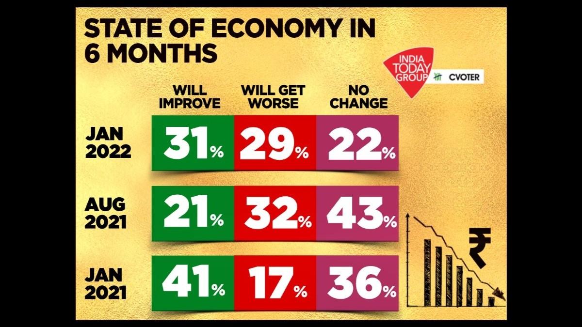 जनता का मानना है कि पिछले छह महीने में देश की अर्थव्यवस्था में सुधार हुआ है. अगस्त 2021 में 21 प्रतिशत लोगों ने माना था कि देश की अर्थव्यवस्था में सुधार हुआ है, वहीं जनवरी 2022 में 31 प्रतिशत लोगों का मानना है कि देश की अर्थव्यवस्था सुधरी है. वहीं अगस्त 2021 में 32 प्रतिशत लोग मानते थे कि देश की अर्थव्यवस्था में सुधार नहीं हुआ है तो वहीं जनवरी 2022 में ऐसा मानने वालों की संख्या घटकर 29 प्रतिशत रह गई. वहीं 2021 अगस्त में 43 प्रतिशत लोगों ने माना कि देश की अर्थव्यवस्था में कोई चेंज नहीं हुई है. जनवरी 2022 में ऐसा मानने वालों की संख्या घटकर 22 प्रतिशत रह गई.