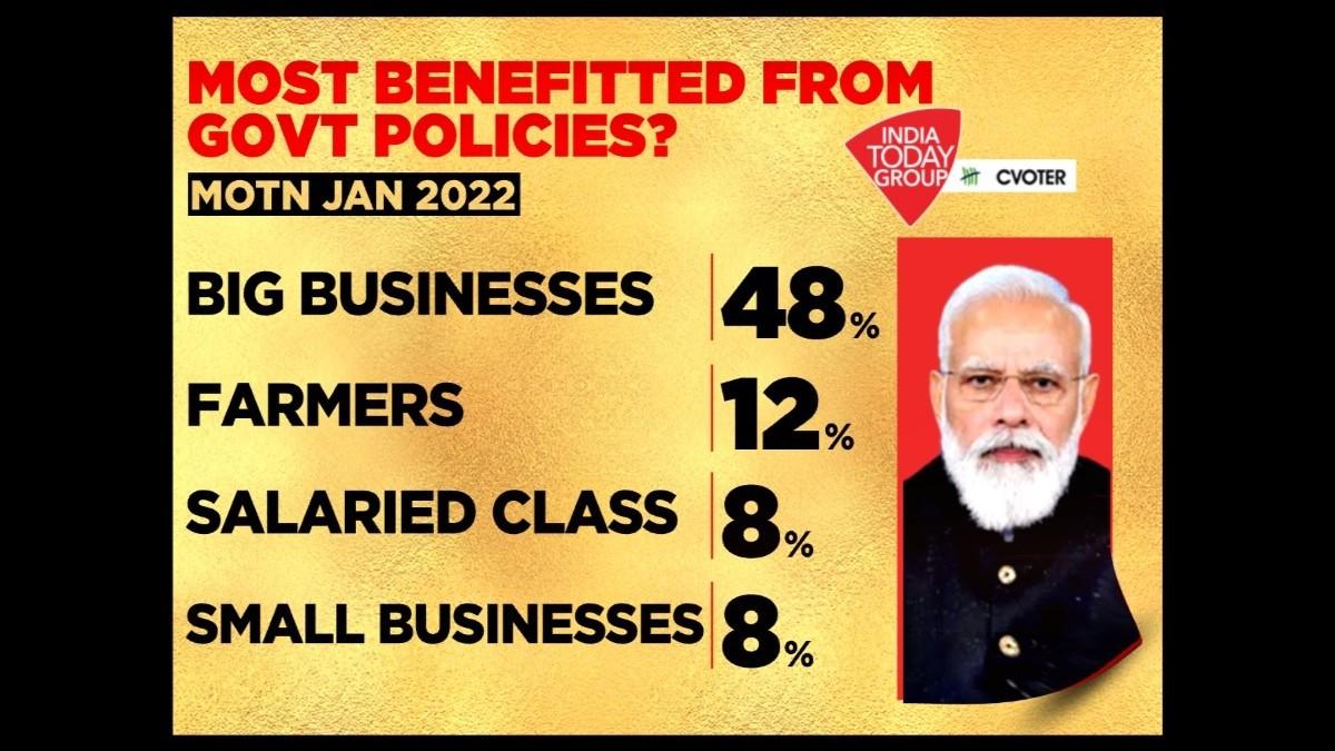 इस सवाल के जवाब में जनता ने बताया कि सरकार की पॉलिसी से 48 प्रतिशत बड़े बिजनेसमैन को लाभ मिला है, जबकि 12 प्रतिशत किसानों के लिए सरकारी नीतियां कारगर साबित हुई हैं. वहीं 8 प्रतिशत वेतनभोगियों को भी सरकार की पॉलिसी का लाभ मिला है तो वहीं 8 प्रतिशत छोटे कारोबारियों को भी मोदी सरकार की नीतियों का लाभ मिला है.