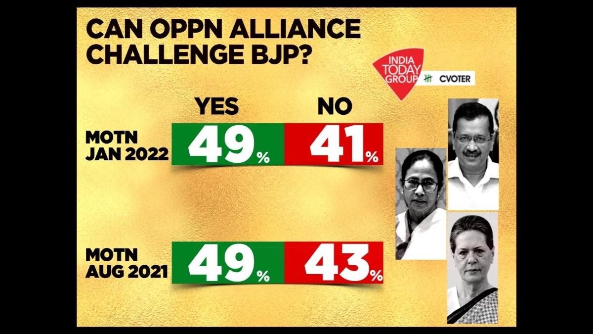 इस सवाल का जवाब कुछ दिलचस्प रहा. छह महीना पहले यानी अगस्त 2021 में 49 प्रतिशत लोगों का मानना था कि विपक्षी गठबंधन भाजपा को चैलेंज कर सकता है. वहीं 6 महीने बाद यानी जनवरी 2022 में भी 49 प्रतिशत लोगों ने भी माना कि विपक्षी गठबंधन भाजपा को चैलेंज कर सकता है. अगस्त 2021 में 43 प्रतिशत लोगों ने माना था कि विपक्षी गठबंधन भाजपा को टक्कर नहीं दे सकता जबकि 2022 जनवरी में 41 फीसदी लोगों ने माना कि विपक्षी गठबंधन भाजपा को टक्कर नहीं दे सकता.