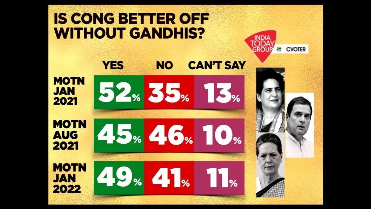 6 महीने पहले 45 प्रतिशत लोगों का मानना था कि कांग्रेस गांधी के बिना कुछ नहीं है. अब 6 महीने बाद यानी जनवरी 2022 में ऐसा मानने वालों की संख्या बढ़कर 52 प्रतिशत हो गई है. 6 महीने पहले 46 प्रतिशत लोग ऐसा नहीं मानते थे. 6 महीने बाद अब 35 फीसदी लोगों का मानना है कि कांग्रेस गांधी के बिना कुछ नहीं है. वहीं 6 महीने पहले 10 प्रतिशत लोगों ने इस सवाल का जवाब देने में असहमति जताई थी जबकि जनवरी 2022 में 13 प्रतिशत लोगों ने सवाल के जवाब में कहा कि कुछ नहीं कह सकते.