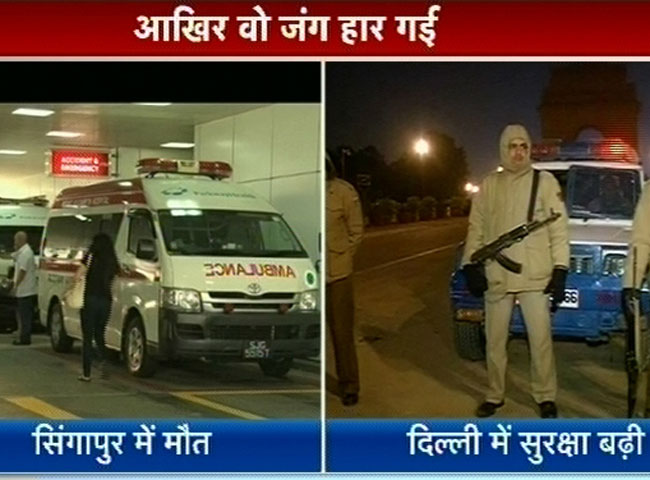दिल्ली में गैंगरेप का शिकार हुई पैरामेडिकल छात्रा ने सिंगापुर के माउंट एलिजाबेथ अस्पताल में दम तोड़ दिया है. मौत की खबर मिलने के बाद दिल्ली में सुरक्षा चौकस कर दी गई है, ताकि किसी भी तरह की अप्रिय घटना न हो सके. दिल्ली पुलिस ने लोगों से शांति बनाए रखने की अपील भी की है. सुरक्षा को देखते हुए दिल्ली के 10 मेट्रो स्टेशन को भी बंद रखा जा रहा है.