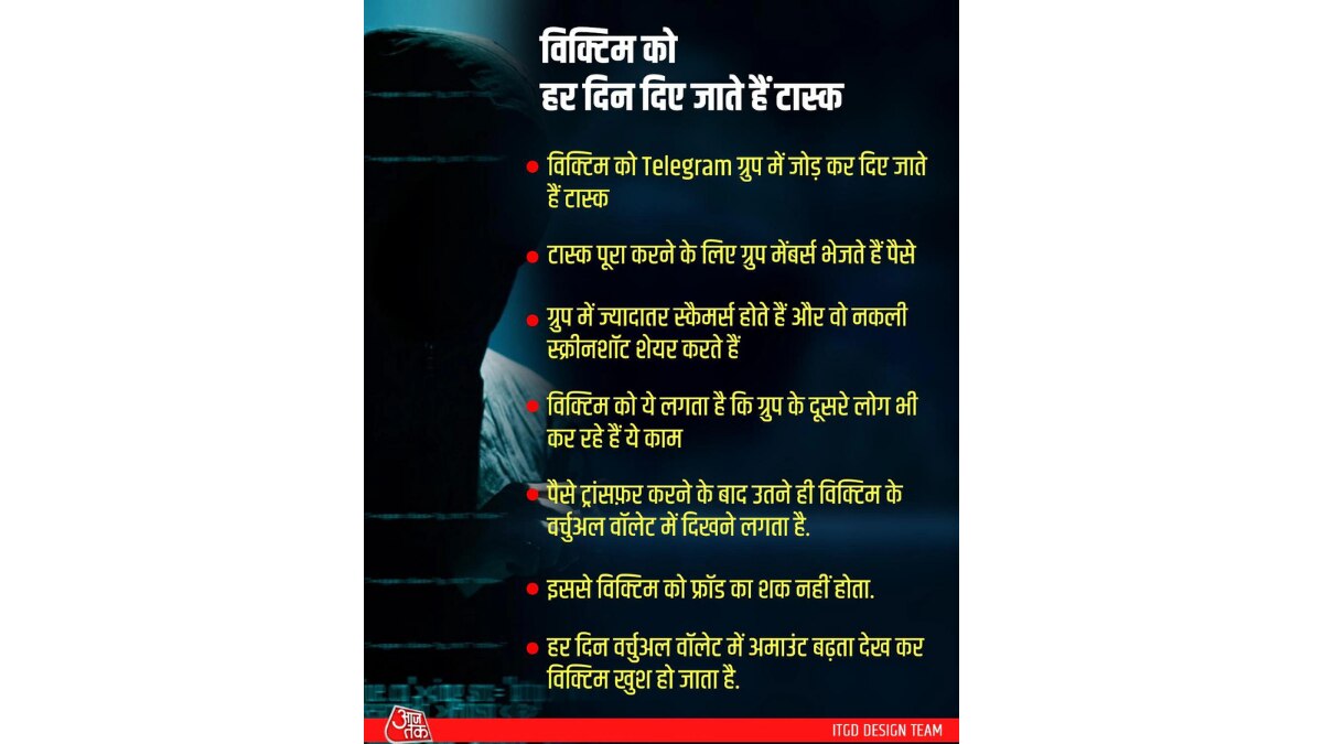 ज़रीना ने पीड़ित महिला से कहा कि आपने कई लिंक्स को लाइक किया है, इसके एवज में आपके खाते में रुपये ट्रांसफर करने हैं, इस रकम को क्रेडिट करने के लिए एक टेलीग्राम लिंक ओपन करिए. वह टेलीग्राम चैनल 'मोहिनी8' के नाम से था. महिला को उस ग्रुप में शामिल होने के लिए कहा गया. इसके बाद महिला के बैंक अकाउंट में 150 रुपये डाल दिए गए. फिर ज़रीना ने भारी लालच के साथ महिला को क्रिप्टोकरेंसी में इन्वेस्ट करने के लिए उसे एक और काम दिया. पहला काम 1000 रुपये से शुरू हुआ. इस तरह वह धीरे-धीरे जाल में फंसती गई और एक ही दिन में करीब 22 लाख रुपये गंवा दिए.