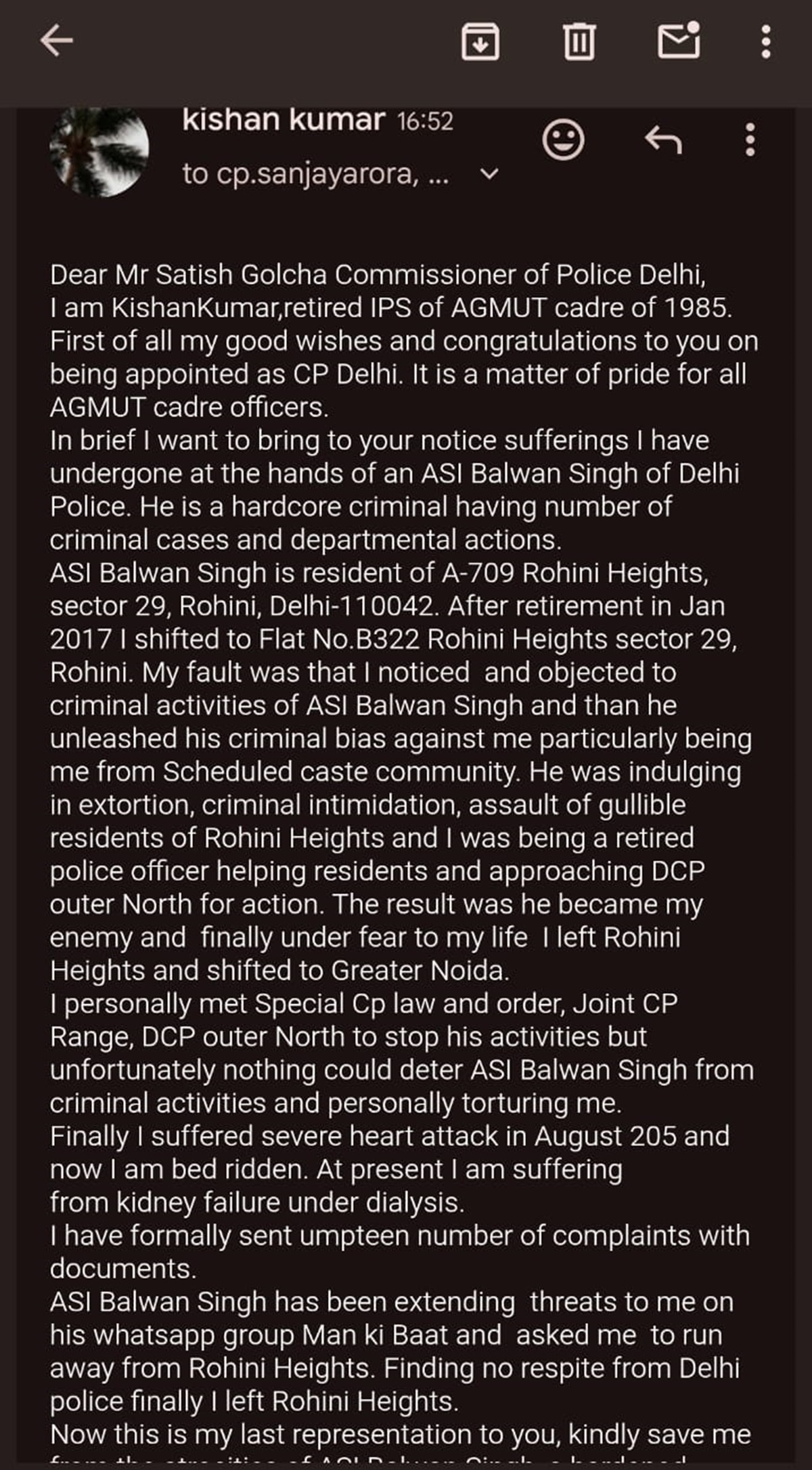 दिल्ली पुलिस में अहम पदों पर रह चुके सेवानिवृत्त पूर्व आईपीएस किशन कुमार ने आरोप लगाया है कि उन्हें दिल्ली पुलिस का एक एएसआई बलवान सिंह लगातार परेशान और प्रताड़ित कर रहा है. उन्होंने इस सिलसिले में दिल्ली के पुलिस कमिश्नर सतीश गोलचा को एक पत्र भेजकर मदद मांगी है. उनका कहना है कि उनकी सेहत ठीक नहीं है, लेकिन हालात ऐसे हो गए हैं कि उन्हें मजबूरन पुलिस कमिश्नर को शिकायत करनी पड़ी.