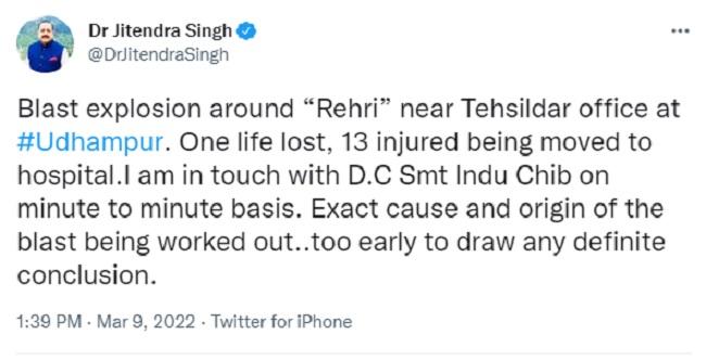 केंद्रीय मंत्री डॉक्टर जितेंद्र सिंह ने भी इस घटना को लेकर ट्वीट किया है. डॉक्टर जितेंद्र सिंह ने ट्वीट कर बताया है कि विस्फोट की घटना तहसीलदार कार्यालय के करीब हुई. घटना को लेकर डीसी इंदु चीब के संपर्क में हूं. गौरतलब है कि जम्मू कश्मीर में आतंकी घटनाएं फिर से बढ़ती दिख रही हैं. अभी चंद दिन पहले ही श्रीनगर के लाल चौक पर भी आतंकियों ने ग्रेनेड हमला किया था. सुरक्षाबलों को निशाना बनाकर आतंकियों ने ग्रेनेड फेंका था.