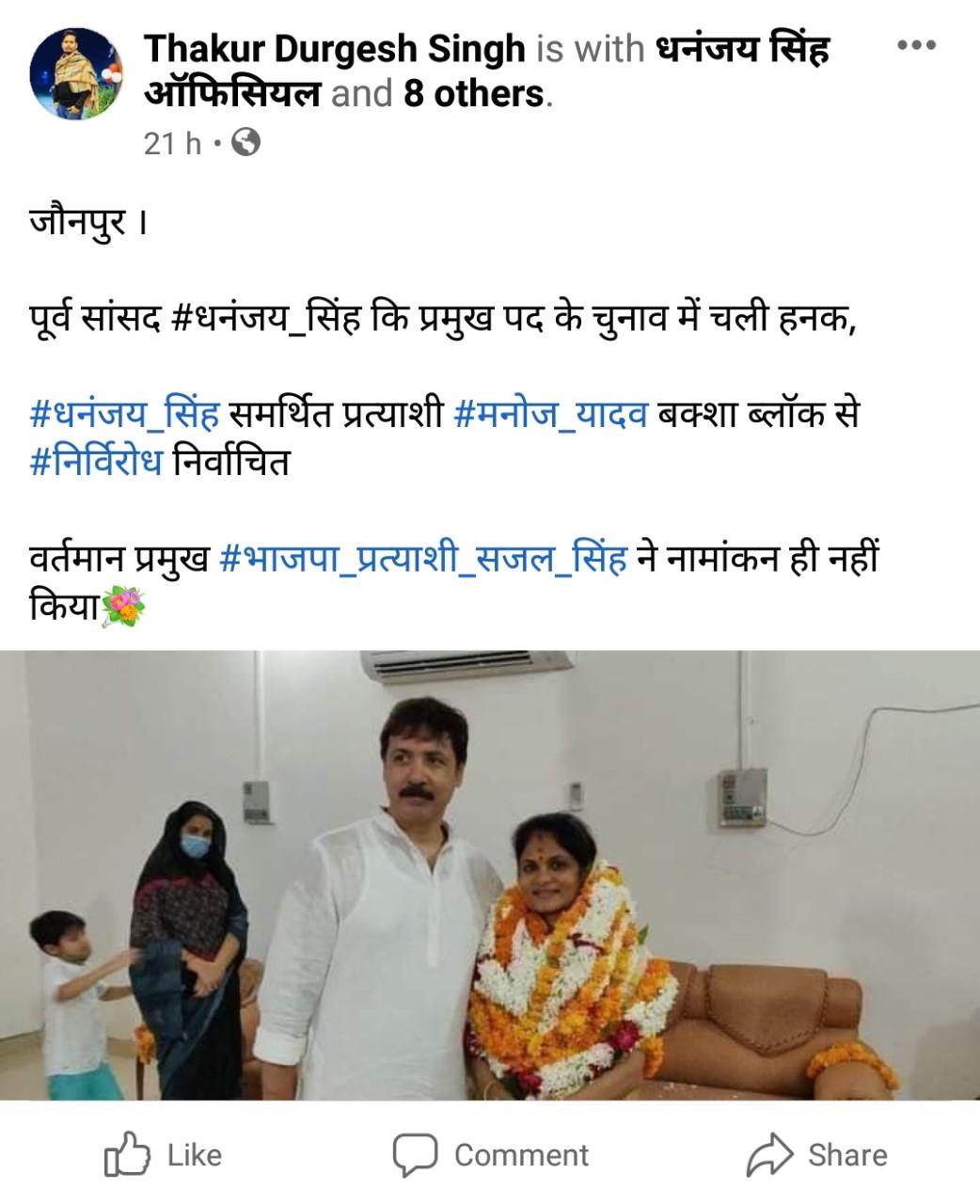 इन तस्वीरों में समर्थक धनंजय सिंह और जौनपुर की जिला पंचायत अध्यक्ष उनकी पत्नी श्रीकला का स्वागत कर रहे हैं, आशीर्वाद ले रहे हैं, बधाई दे रहे हैं. और तो और, सोशल मीडिया पर हाई स्पीड बाइक चलाते धनंजय सिंह का वायरल हुआ वीडियो भी जिला पंचायत अध्यक्ष का चुनाव जीतने के बाद का बताया जा रहा है.