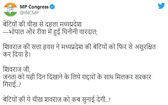एमपी में रेप की घटनाओं पर राज्य कांग्रेस एमपी सरकार पर हमलावर है. एमपी कांग्रेस ने ट्वीट कर कहा है कि ,"बेटियों की चीख से दहला मध्यप्रदेश, भोपाल और रीवा में हुई घिनौनी वारदात; शिवराज की सत्ता हवस ने मध्यप्रदेश की बेटियों को फिर से असुरक्षित कर दिया है. शिवराज जी, जनता को यही दिन दिखाने के लिये ग़द्दारों के साथ मिलकर सरकार गिराई? बेटियों की ये चीख शवराज को कब सुनाई देगी.?"