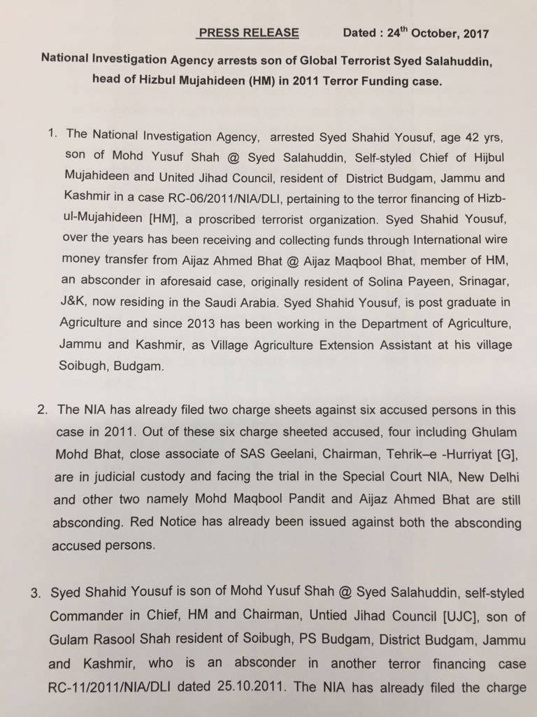 राष्ट्रीय सुरक्षा एजेंसी (NIA) ने टेरर फंडिंग मामले में बड़ी कार्रवाई करते हुए हिज्बुल मुजाहिद्दीन के फाउंडर सैयद सलाहुद्दीन के बेटे को गिरफ्तार किया है. NIA ने शाहिद युसुफ को नई दिल्ली से गिरफ्तार किया है. युसुफ की गिरफ्तारी 2011 के एक टेरर फंडिंग मामले में की गई है. सैयद सलाहुद्दीन का बेटा जम्मू-कश्मीर सरकार के कृषि विभाग में जूनियर इंजिनियर है.