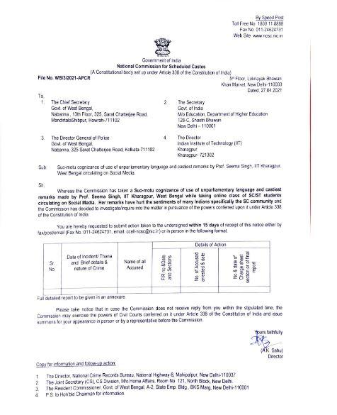 आईआईटी खड़गपुर में प्रोफेसर ने कुछ SC (अनुसूचित जाति) छात्रों के साथ जाति सूचक शब्दों का प्रयोग किया है. इस घटना का वीडियो सोशल मीडिया पर वायरल होने पर राष्ट्रीय अनुसूचित जाति आयोग के अध्यक्ष विजय सापला ने आईआईटी खड़गपुर के निदेशक, सचिव भारत सरकार हायर एजुकेशन, पश्चिम बंगाल के चीफ सेक्रेटरी और DGP को जांच के आदेश दिए हैं. आयोग ने इस घटना पर 15 दिन में जवाब मांगा है.