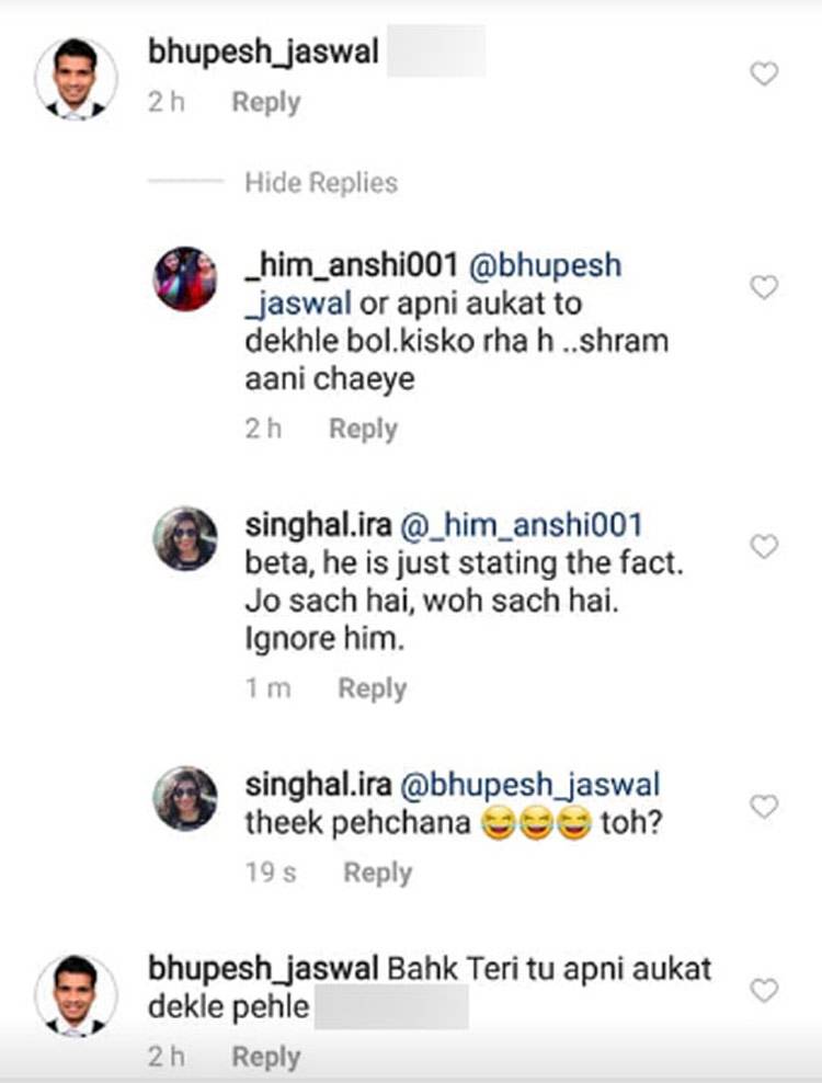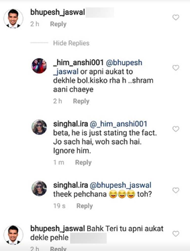 इरा ने फेसबुक पर लिखा "जो लोग सोचते हैं कि दिव्यांग लोगों को कुछ भी सामना नहीं करना पड़ता क्योंकि दुनिया उनके प्रति अच्छी और दयालु है तो ऐसा बिल्कुल भी नहीं है. सच्चाई दिखाने के लिए मैं अपने इंस्टाग्राम अकाउंट से किसी की टिप्पणियों को साझा कर रही हूं जो साइबर बुलिंग का चेहरा दर्शाता है. ये बात काफी दुर्भाग्यपूर्ण है वह व्यक्ति सिविल सर्वेंट बनना चाहता है. यही कारण है कि हमें ऐसे स्कूलों ऐसी शिक्षा प्रणाली की आवश्यकता है कि किसी भी चीज से ज्यादा जरूरी एक बेहतरीन इंसान बनना जरूरी है. बता दें, जिस शख्स ने इरा के इंस्टाग्राम अकाउंट पर अपशब्द लिखे हैं उस शख्स का नाम भूपेश जसवाल है.