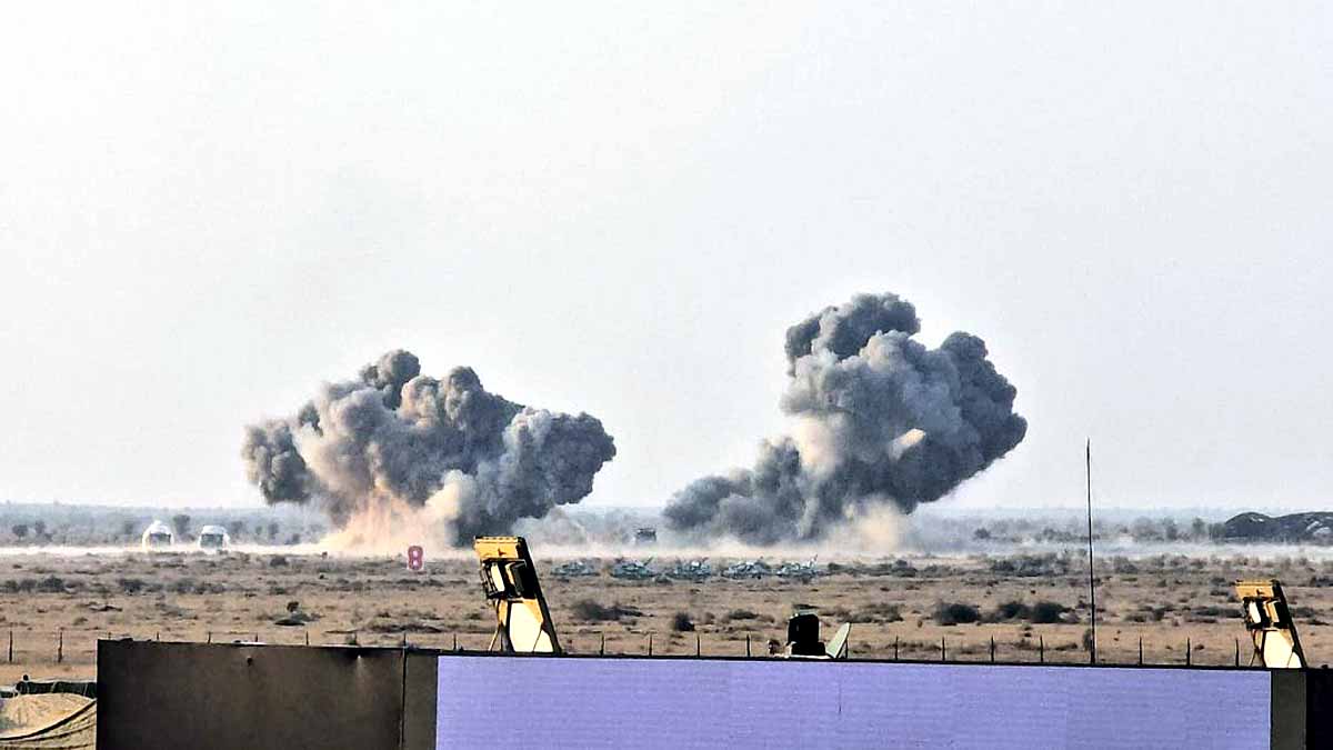 रिहर्सल में राफेल लड़ाकू विमान ने सुपरसोनिक बूम के साथ शुरुआत की, जिससे पूरी रेंज थर्रा उठी. सुखोई-30 MKI ने दुश्मन के रनवे और ठिकानों पर 44 बम गिराए. मिग-29 ने टैंक काफिले को नष्ट किया, जबकि जगुआर ने सुदर्शन फॉर्मेशन में टारगेट पर हमला किया. Photo: ITG