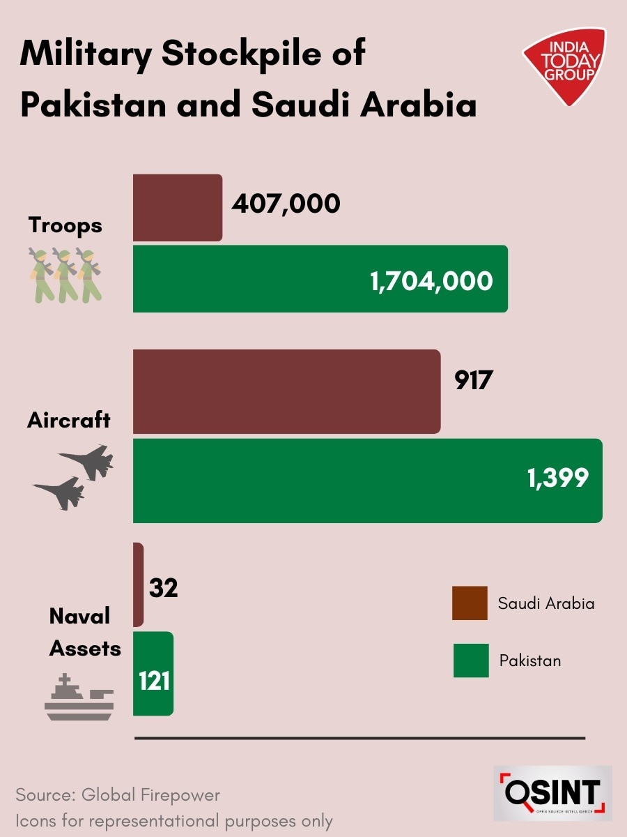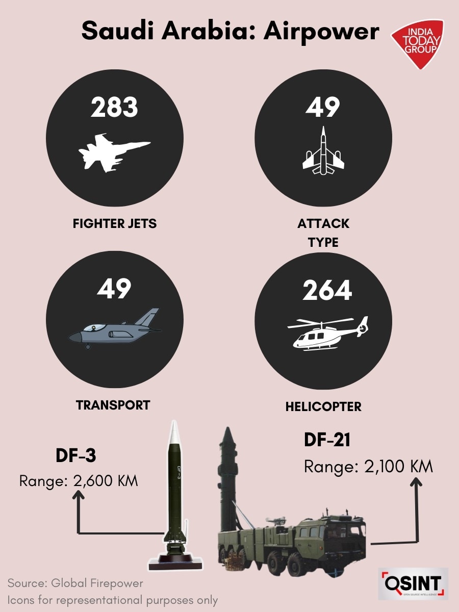 सऊदी अरब अपने ज़्यादातर हथियार अमेरिका, चीन और यूरोपीय देशों से खरीदता है. उसके पास करीब 280 लड़ाकू विमान हैं, जिनमें ज़्यादातर अमेरिका में बने फोर्थ जेनरेशन के F-15S और F-15C शामिल हैं. इसके अलावा जर्मनी से मिले यूरोफाइटर टाइफून और पनाविया टॉरनेडो जेट भी हैं. सऊदी अरब के पास अमेरिका निर्मित THAAD और पैट्रियट जैसी मिसाइल रक्षा प्रणालियां भी मौजूद हैं. सऊदी अरब की मिसाइल क्षमता के बारे में विस्तृत जानकारी अभी भी साफ नहीं है, लेकिन उसके पास चीन से खरीदी गई दो मध्य दूरी की मिसाइलें हैं- DF-3 और DF-21. दोनों ही पारंपरिक मिसाइलें हैं, जिन्हें परमाणु हथियार दागने के लिए डिज़ाइन नहीं किया गया है. इसका मतलब है कि ज़रूरत पड़ने पर सऊदी अरब को पाकिस्तान से हथियार के अलावा परमाणु क्षमता वाली मिसाइलों की भी ज़रूरत होगी.