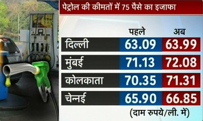 तेल की कीमतों में एक बार फिर बढ़ोतरी की गई है. पेट्रोल की कीमतों में 75 पैसे की बढ़ोतरी की गई है जबकि डीजल में भी 50 पैसे प्रति लीटर का इजाफा किया गया है.