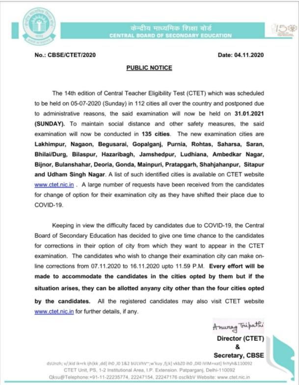सीबीएसई ने उम्मीदवारों को शहर के अपने ऑप्शन को बदलने की अनुमति भी दी है. परीक्षा शहर बदलने का विकल्प 7 नवंबर से खुलेगा और उम्मीदवार 16 नवंबर तक इस सुविधा का उपयोग कर सकेंगे. सीबीएसई ने कहा है कि उनके द्वारा चुने गए शहरों में उम्मीदवारों को एग्जाम सेंटर देने के लिए हर संभव प्रयास किया जाएगा, लेकिन अगर स्थिति पैदा होती है, तो उन्हें किसी भी शहर को अलॉट किया जा सकता है.