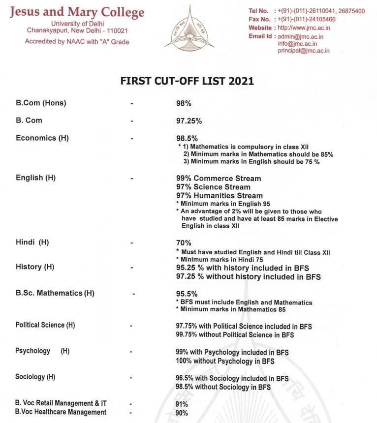 जीसस एंड मैरी कॉलेज में BA (ऑनर्स) साइकोलॉजी कोर्स के लिए अधिकतम कट-ऑफ 100 प्रतिशन निर्धारित की गई है.