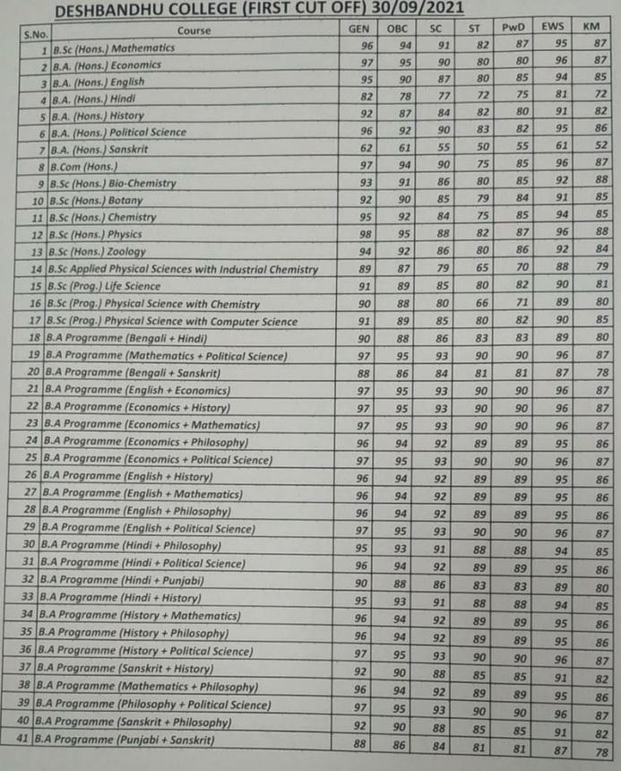 दिल्ली विश्वविद्यालय के देशबंधु कॉलेज ने पहली कट-ऑफ लिस्ट जारी कर दी है. कॉलेज ने फिजिक्स के लिए 98 प्रतिशत (अनारक्षित) और अर्थशास्त्र, बीकॉम (ऑनर्स) और अन्य कोर्सेज़ के लिए 97 प्रतिशत स्कोर मांगा है.