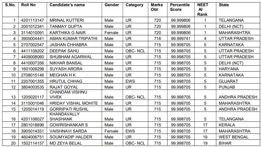 नीट यूजी परीक्षा का रिजल्ट जारी कर दिया गया है. इस वर्ष मृणाल कुटेरी, तन्मय गुप्ता, कार्तिका जी नायर पे AIR 1 हासिल कर परीक्षा में टॉप किया है.