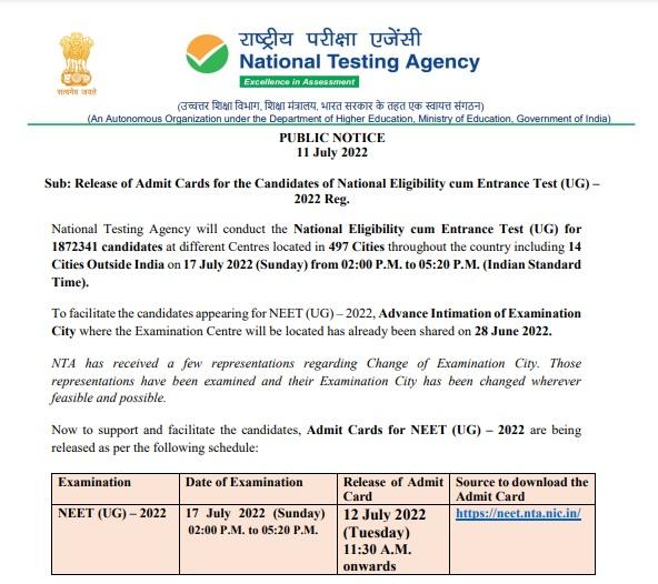NEET UG Admit Card 2022 LIVE Updates: NEET UG Admit Card 2022 @neet.nta.nic.in LIVE Updates: नेशनल एलिजिबिलिटी कम एंट्रेंस टेस्ट अंडरग्रेजुएट (NEET UG 2022) का एडमिट कार्ड आज 12 जुलाई को जारी कर दिया गया है. NEET परीक्षा के एडमिट कार्ड आधिकारिक वेबसाइट neet.nta.nic.in और nta.ac.in पर जारी किए गए हैं. एडमिट कार्ड डाउनलोड लिंक वेबसाइट के होमपेज पर लाइव हैं. उम्मीदवार अपने रजिस्ट्रेशन नंबर और डेट ऑफ बर्थ की मदद से वेबसाइट पर लॉगिन कर सकते हैं और एडमिट कार्ड डाउनलोड कर सकते हैं. परीक्षा के संबंध में कोई भी अपडेट पाने के लिए उम्मीदवार हमारे साथ बने रहें.