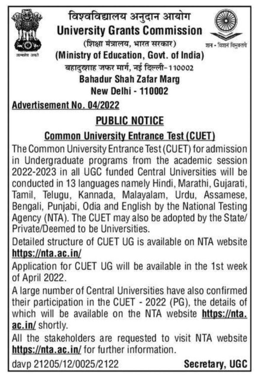 स्टेट या प्राइवेट डीम्ड यूनिवर्सिटीज़ भी इस एग्जाम से संबद्धता ले सकते हैं. जारी नोटिस में कहा गया है कि बड़ी संख्या में सेंट्रल यूनिवर्सिटीज़ ने CUET 2022 में अपना पार्टिसिपेशन सुनिश्चित किया है. इसकी डिटेल्स जल्द nta.ac.in पर जारी की जाएंगी. उम्मीदवार आवेदन के संबंध कोई भी अन्य अपडेट ऑफिशियल वेबसाइट पर पा सकेंगे.