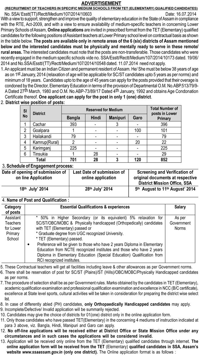 असम सर्व शिक्षा अभियान ने एलिमेंटरी एजुकेशन में शिक्षकों के लिए 852 भर्तियां निकाली हैं. यह भर्तियां असम के छह जिलों के लिए हैं. आवेदन की अंतिम तिथि 28 अगस्त है.