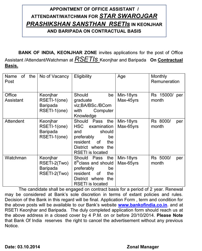 बैंक ऑफ इंडिया, क्योंझार ज़ोन, ओडिशा के नाम से कई जगह फर्जी जॉब वैकेंसी की खबर प्रकाशित की गई है. इस जॉब न्यूज में ऑफिस असिस्टेंट, अटेंडेंट और वॉचमैन समेत आठ पदों के लिए नोटिफिकेशन जारी होने की सूचना दी गई है.