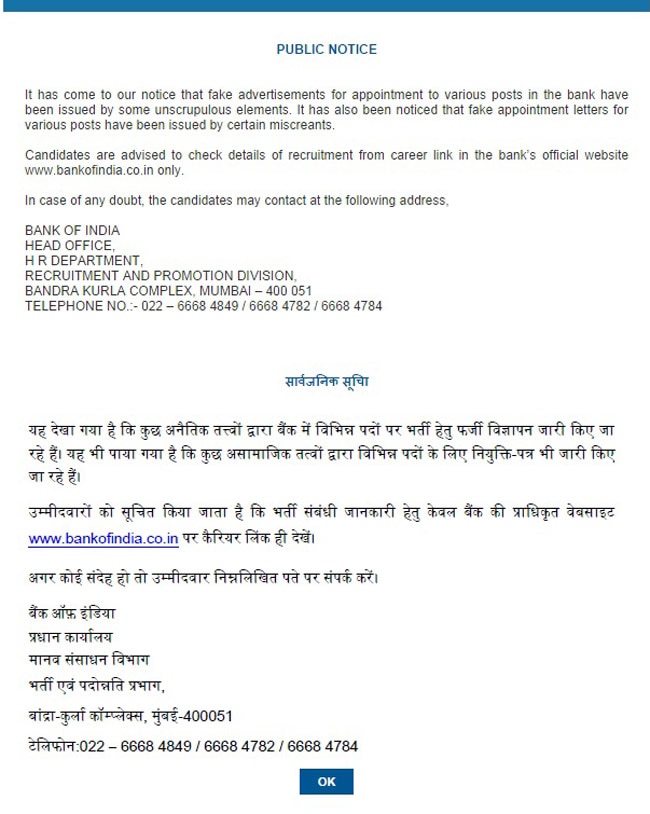यही नहीं ख्ाबरों में यह भी कहा गया है कि बैंक ऑफ इंडिया बिना बताए इस जॉब नोटिफिकेशन को कैंसिल भी कर सकता है. उधर, बैंक ऑफ इंडिया ने अपनी ऑफिशियल साइट पर जॉब से संबंधित इस सूचना को गलत बताते हुए कहा है कि यह कुछ असामाजिक तत्वों का अनैतिक काम है.