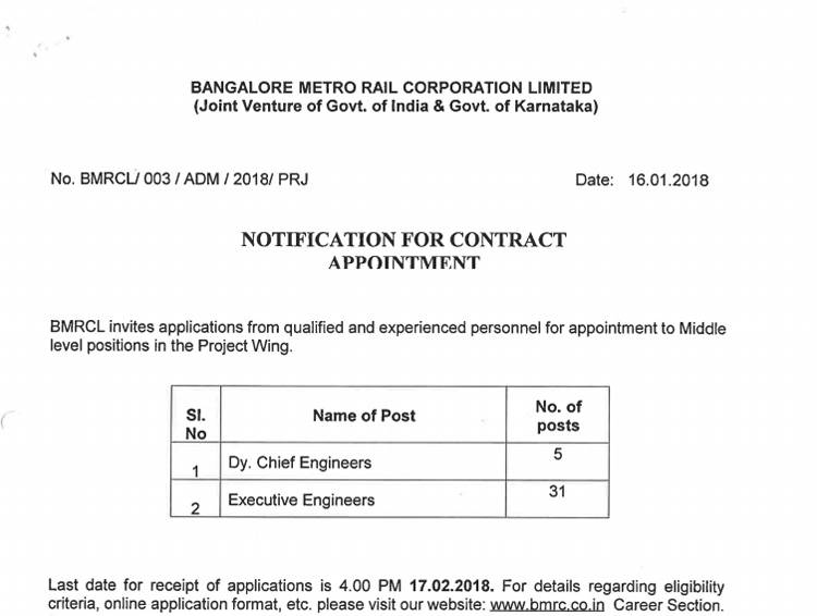 Bangalore Metro Rail Corporation (BMRC) ने Deputy Chief Engineer और Executive Engineer के पदों पर वैकेंसी निकली है. इन पदों पर आवेदन करने के लिए नोटिफिकेशन जारी कर दिया गया है. इस सरकारी नौकरी के लिए पहले रोजगार संबंधी सभी आवश्यक जानकारियां पढ़ लें.