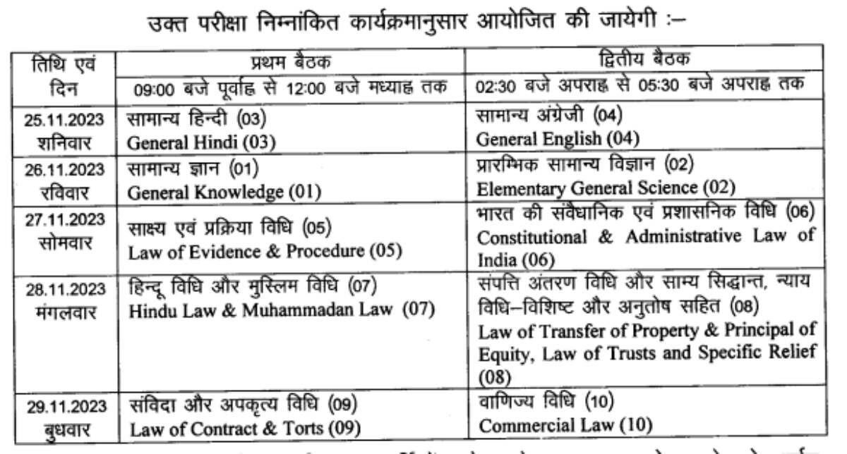 उम्मीदवार बीपीएससी 32वीं न्यायिक मुख्य परीक्षा 2023 दो शिफ्ट में आयोजित की जाएगी, जिसमें पहला सेशन सुबह 9 बजे से दोपहर 12 बजे तक और दूसरा सेशन दोपहर 2:30 बजे से शाम 5:30 बजे तक होगा. शिफ्ट वाइज एग्जाम डेट शेड्यूल यहां देखें-