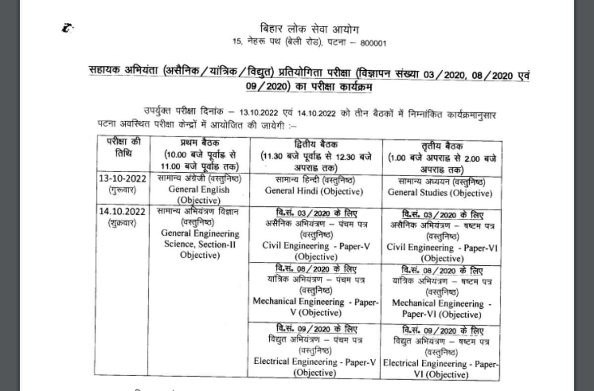 BPSC AE Admit Card 2022, Exam Dates: बिहार लोक सेवा आयोग (BPSC) ने असिस्टेंट इंजीनियर भर्ती 2020 शेड्यूल जारी कर दिया है. बिहार में असिस्टेंट इंजीनियर जॉब का कॉम्पिटेटवि एग्जाम सिविल, मैकेनिकल और इलेक्ट्रिकल ट्रेड के लिए होगा. जिन उम्मीदवारों ने इस सरकारी नौकरी (Bihar Govt Jobs) के लिए आवेदन किया था. वे आयोग (बीपीएससी) की आधिकारिक वेबसाइट bpsc.bih.nic.in पर जाकर एग्जाम शेड्यूल चेक और डाउनलोड कर सकते हैं.