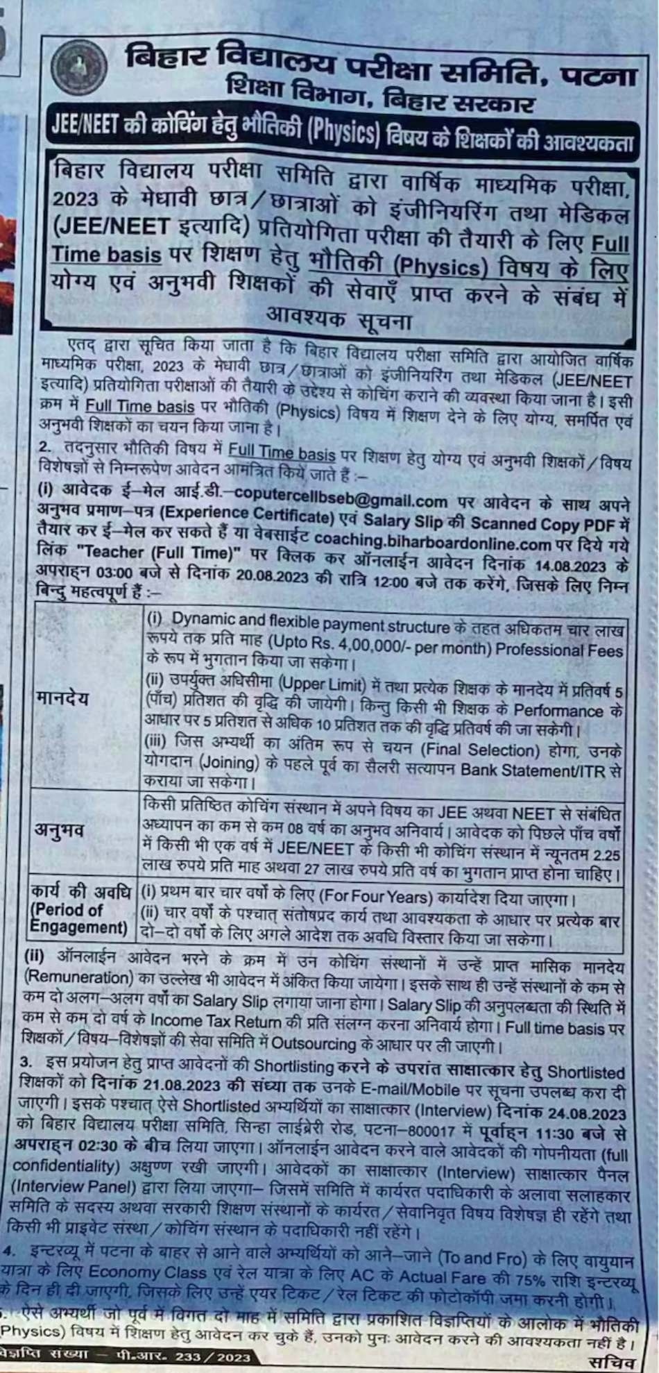 इंजीनियरिंग और मेडिकल की प्रतियोगी परीक्षा (ज्वाइंट एंट्रेंस एग्जाम या JEE और नेशनल एलिजिबिलिटी कम एंट्रेंस टेस्ट या NEET) की तैयारी के लिए बिहार विद्यालय परीक्षा समीति की ओर से फिजिक्स टीचर की भर्ती निकाली है. ऑनलाइन आवेदन 14 अगस्त से शुरू हो चुके हैं. इच्छुक और योग्य उम्मीदवार coaching.biharboardonline.com की आधिकारिक वेबसाइट पर जाकर 21 अगस्त 2023 रात 12 बजे तक ऑनलाइन आवेदन कर सकते हैं.