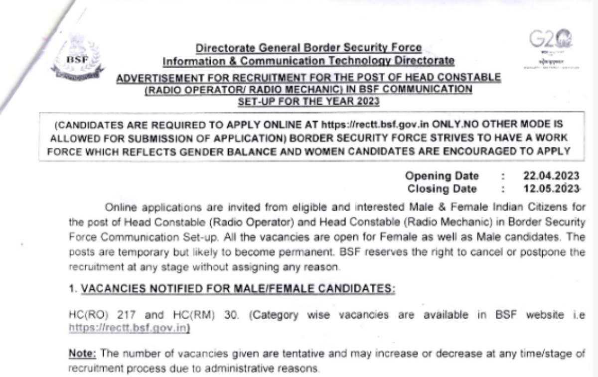 BSF Head Constable Vacancy 2023: यहां देखें वैकेंसी डिटेल्स