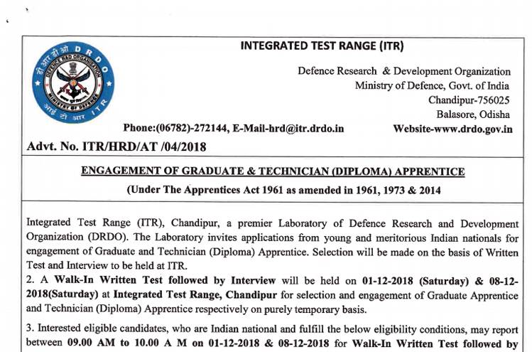इच्छुक उम्मीदवार DRDO की आधिकारिक वेबसाइट itr.drdo.in पर जाकर आवेदन कर सकते हैं.
