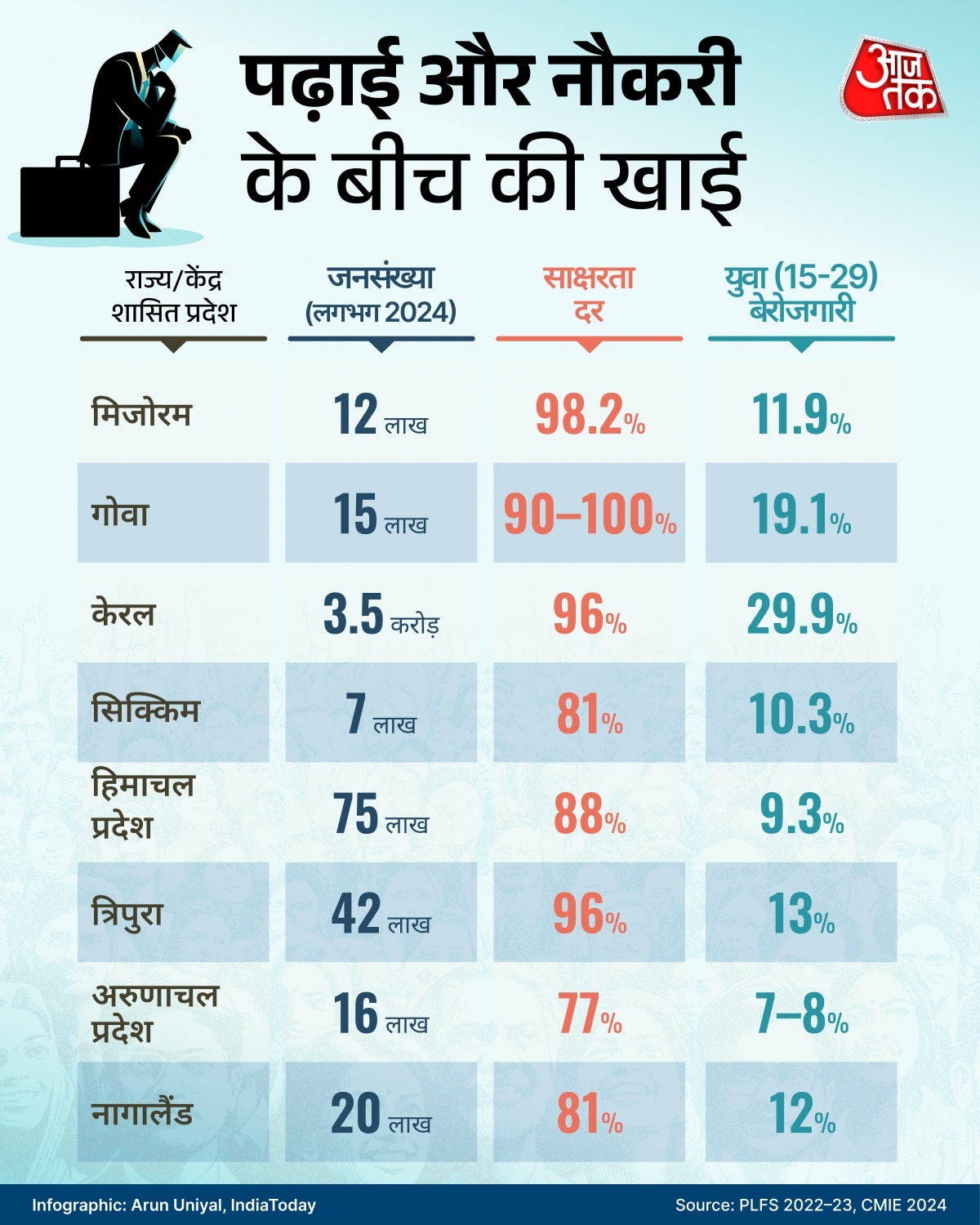 केरल, गोवा और मिजोरम तीनों राज्य भारत में 90 प्रतिशत से ज्यादा साक्षरता दर पार कर चुके हैं. लेकिन इन शानदार आंकड़ों के पीछे एक बड़ा सवाल छिपा है कि जब इतने लोग पढ़े-लिखे हैं तो फिर इतने शिक्षित युवा बेरोजगार क्यों हैं? पीरियॉडिक लेबर फोर्स सर्वे (PLFS) 2022-23 के मुताबिक ये राज्य भले ही साक्षरता और सामाजिक विकास में आगे हों लेकिन युवाओं में बेरोजगारी की दर भी यहीं सबसे ज्यादा है.