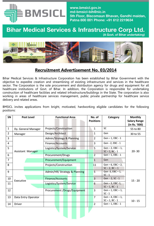 बिहार मेडिकल सर्विसेज एंड इंफ्रास्ट्रक्चर कॉरपोरेशन लिमिटेड (BMSICL) में मैनेजर, जनरल मैनेजर, एग्जीक्यूटिव समेत कई अन्य पदों के लिए भर्तियां निकली हैं. आवेदन 10 सितंबर तक स्वीकार किए जाएंगे.