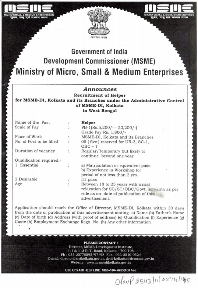 माइक्रो, स्मॉल एंड मीडियम इंटरप्राइजेज (MSME)कोलकाता में हेल्पर के लिए वैकेंसी निकली हैं. इच्छुक उम्मीदवार 26 अक्टूबर तक आवेदन कर सकते हैं.