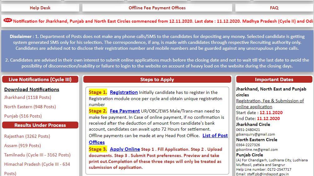 भारतीय डाक विभाग के झारखंड, नॉर्थ ईस्टर्न और पंजाब सर्किल में GDS के पदों पर आवेदन करने के लिए उम्मीदवारों को आधिकारिक वेबसाइट appost.in पर जाना होगा. बता दें कि आवेदन की अंतिम तिथि 11 दिसंबर 2020 निर्धारित है. अधिक जानकारी के लिए यहां क्लिक करके आधिकारिक नोटिफिकेशन देख सकते हैं.