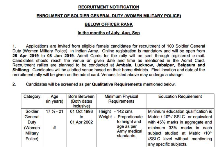 Indian Army Women Recruitment 2019: पहली बार, भारतीय सेना ने महिला सैन्य पुलिस के लिए जनरल ड्यूटी (महिला सैन्य पुलिस) के 100 पदों पर भर्ती निकाली है. अगर आपको भारतीय सेना में भर्ती होने और अपने देश की सेवा करना चाहते हैं तो इन पदों पर आवेदन कर सकते हैं. आवेदन प्रक्रिया अभी रही है. बता दें, आवेदन करने की आखिरी तारीख 8 जून 2019 है.