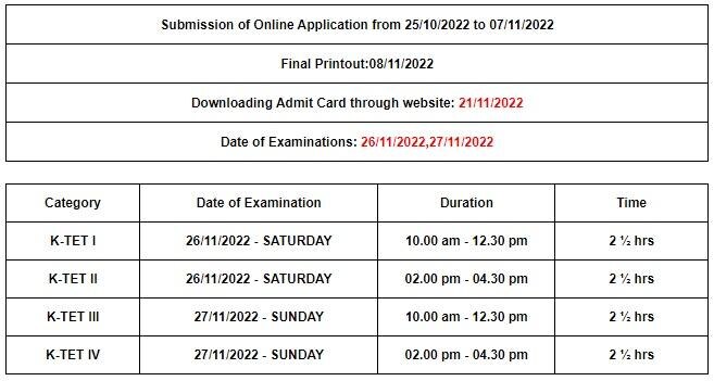 जो उम्मीदवार लास्ट डेट तक अपना रजिस्ट्रेशन दर्ज कर देंगे, उनके प्रोविजनल एडमिट कार्ड 21 नवंबर को जारी कर दिए जाएंगे. उम्मीदवार अपने एडमिट कार्ड के प्रिंट आउट के साथ परीक्षा के लिए उपस्थित हो सकेंगे. जारी शेड्यूल के अनुसार, केरल टीईटी परीक्षा 26 और 27 नवंबर को आयोजित की जाएगी. परीक्षा सुबह और शाम की 2 शिफ्ट में आयोजित होगी. परीक्षा की अवधि 2.5 घंटे की होगी. अन्य सभी जानकारियां उम्मीदवार नीचे दिए गए नोटिस में चेक कर सकते हैं.