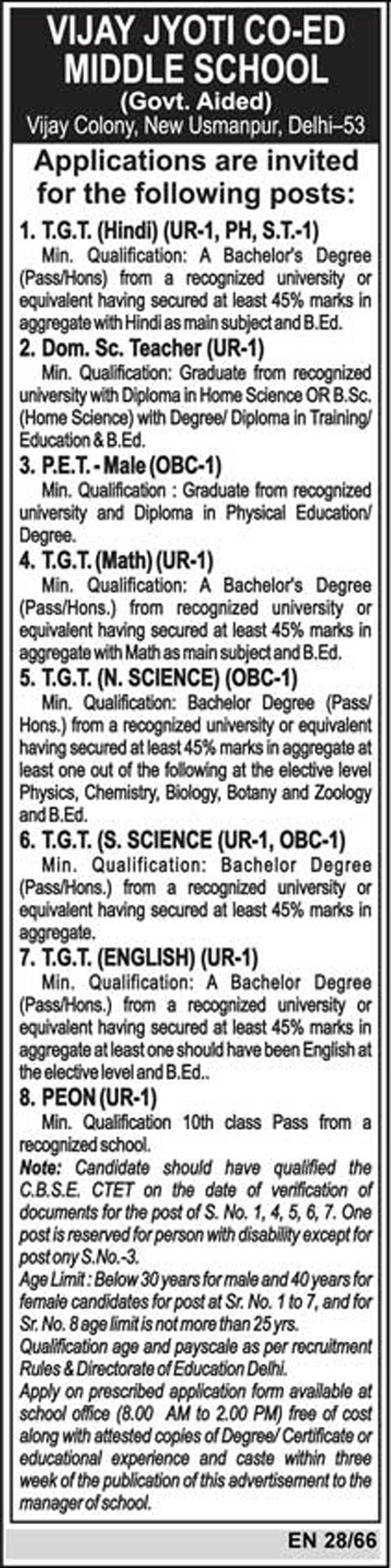 विजय ज्योति को-एड मिडल स्कूल, नई दिल्ली में टीचिंग और नॉन-टीचिंग पदों के लिए वैकेंसी निकली हैं. इच्छुक उम्मीवार 31 अक्टूबर तक आवेदन कर सकते हैं.पद का नाम: टीजीटी: 7साइंस टीचर: 1पीईटी (मेल): 1चपरासी: 1