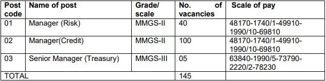 पंजाब नेशनल बैंक में कुल 145 पदों पर भर्तियां निकाली गई हैं. जिसमें से मैनेजर (रिस्क) के 40 , मैनेजर (क्रेडिट) के 100 और सीनियर मैनेजर (ट्रेजरी) के पांच पद शामिल हैं.