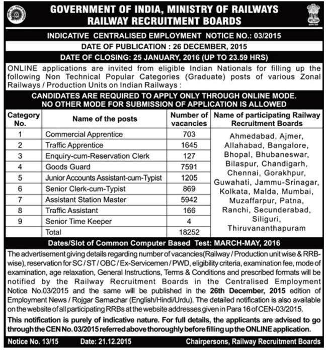 रेलवे रिक्रूटमेंट बोर्ड (RRB) ने कई पदों के लिए वैकेंसी निकाली है. इच्छुक उम्मीदवार 25 जनवरी 2016 तक आवेदन कर सकते हैं.