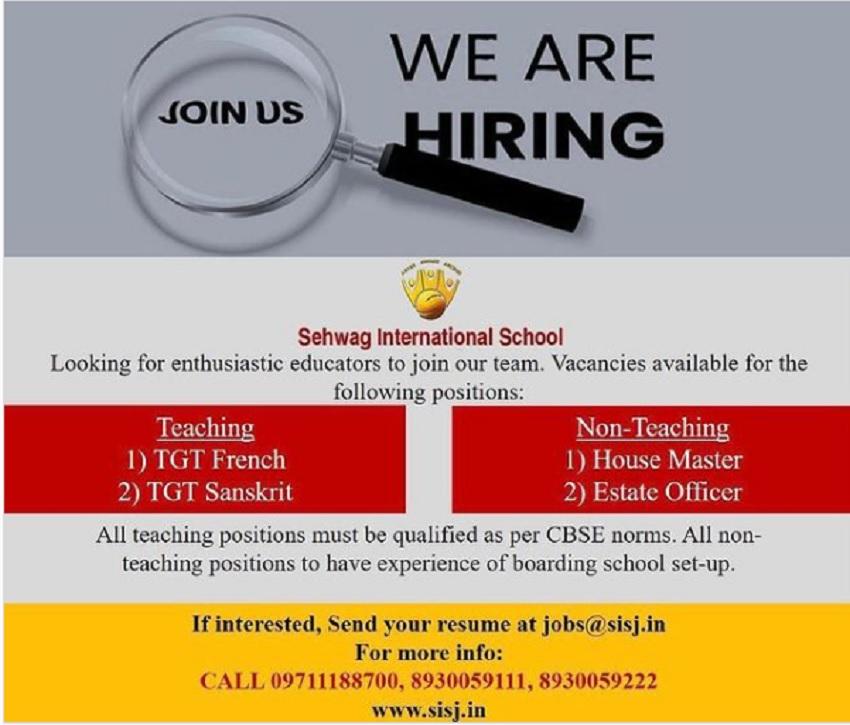 Sehwag International School Jobs 2022: पूर्व भारतीय क्रिकेटर वीरेंद्र सहवाग ने अपने सोशल मीडिया हैंडल पर सहवाग इंटरनेशनल स्कूल में एकेडमिक स्टाफ के रिक्त पदों को भरने की जानकारी दी है. स्कूल में टीचिंग और नॉन टीचिंग दोनो के पद रिक्त हैं. टीचिंग पोस्ट पर टीजीटी फ्रेंच और टीजीटी संस्कृत के पदों पर भर्ती की जानी है जबकि नॉन टीचिंग पोस्ट पर हाउस मास्टर और एस्टेंट ऑफिसर पदों पर भर्ती की जाएगी. कुल कितनी रिक्तियों पर भर्ती होगी, इसकी कोई जानकारी नहीं दी गई है.
