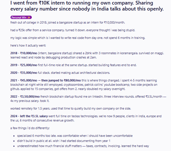 उनकी सैलरी एक दिन में ही नहीं बढ़ गई, इसके लिए उन्होंने नए स्किल्स सीखें. जैसे-जैसे उनकी जिम्मेदारियां बढ़ती गईं, उनकी आय में धीरे-धीरे बढ़त होते गई. 2019 में उन्होंने 25,000 रुपये प्रति माह की नौकरी शुरू की. यहां उन्होंने प्रोडक्ट की पूरी फीचर्स को शुरुआत से लेकर आखिर तक खुद बनाकर तैयार किया. 2020 तक, उनकी सैलरी बढ़कर 35,000 रुपये प्रति माह हो गया क्योंकि उन्होंने फुल-स्टैक डेवलपर की भूमिका संभाली और तकनीकी फैसलों में योगदान देना शुरू कर दिया.