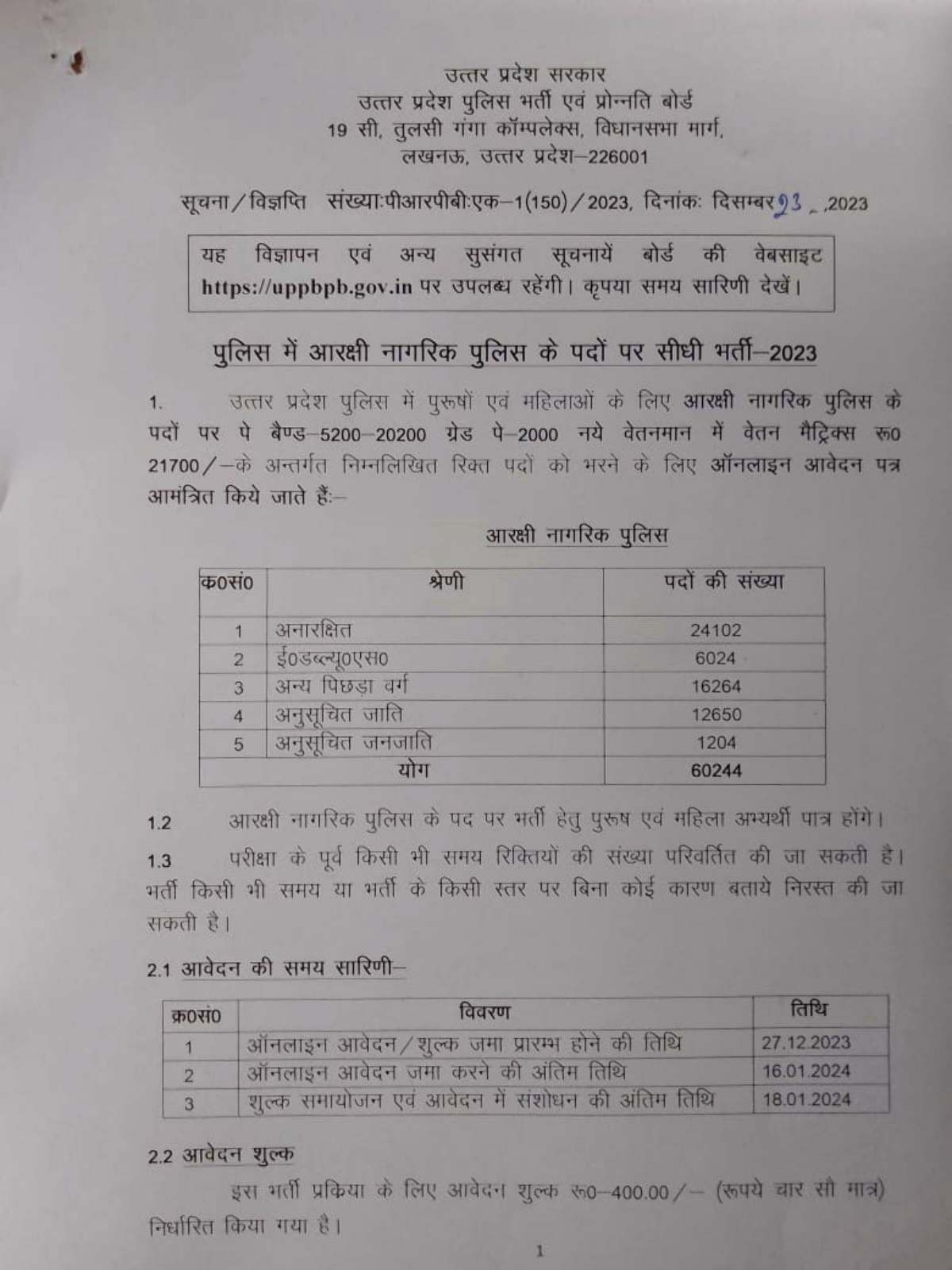 UPPRPB द्वारा जारी नोटिफिकेशन के अनुसार, यूपी पुलिस में कॉन्स्टेबल के कुल 60,244 पद भरे जाएंगे जिसकी आवेदन प्रक्रिया 27 दिसंबर 2023 से शुरू होगी. हालांकि परीक्षा से पहले रिक्तियों में बदलवा भी हो सकता है. महिला व पुरुष उम्मीदवार इस भर्ती के लिए आवेदन कर सकते हैं.