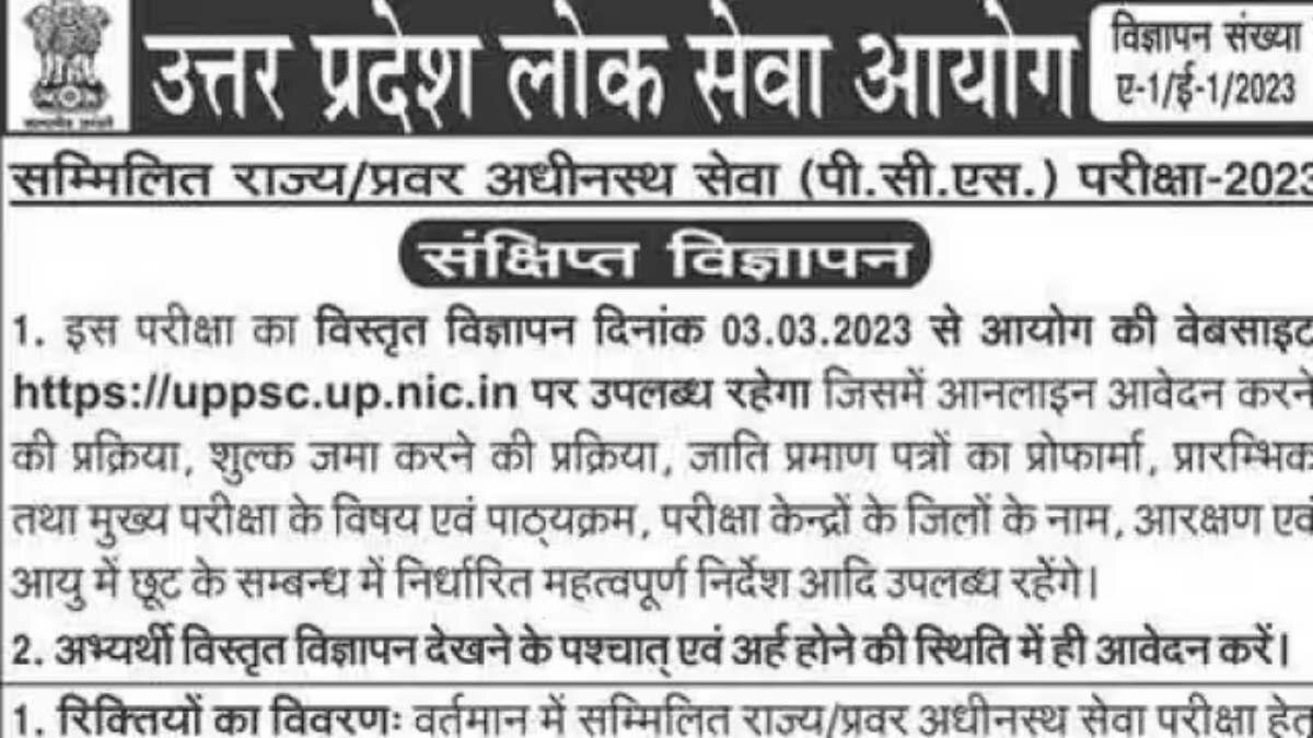 यूपी में सरकारी नौकरी की तैयारी कर रहे उम्मीदवारों के लिए आवेदन का अच्छा मौका है. इच्छुक और योग्य उम्मीदवार, यूपीपीएससी की आधिकारिक वेबसाइट uppsc.up.nic.in पर जाकर आवेदन कर सकेंगे. आयोग ने पीसीएस 2023 का शॉर्ट नोटिस गुरुवार को जारी कर दिया है. आयोग 03 मार्च को इसका डिटेल्ड नोटिफिकेशन जारी कर सकता है.