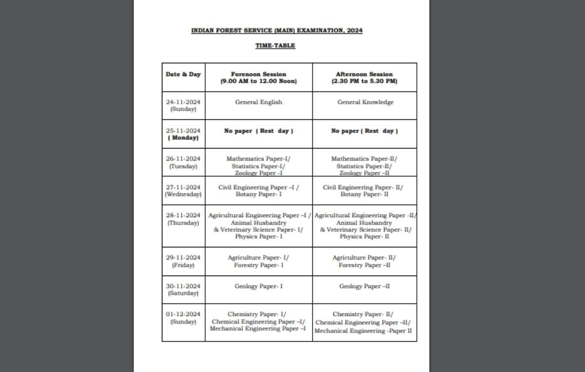 यूपीएससी द्वारा जारी शेड्यूल नोटिस के अनुसार, आईएफएस मेन्स एग्जाम 24 नवंबर से शुरू होंगे और 01 दिसंबर 2024 तक चलेंगे. तीन घंटे के परीक्षा दो शिफ्ट में होगी. पहली शिफ्ट सुबह 9 बजे से 12 बजे तक और दूसरी शिफ्ट दोपहर 2:30 बजे से शाम 5:30 बजे तक चलेगी. हालांकि 25 नवंबर 2024 को कोई परीक्षा नहीं होगी.