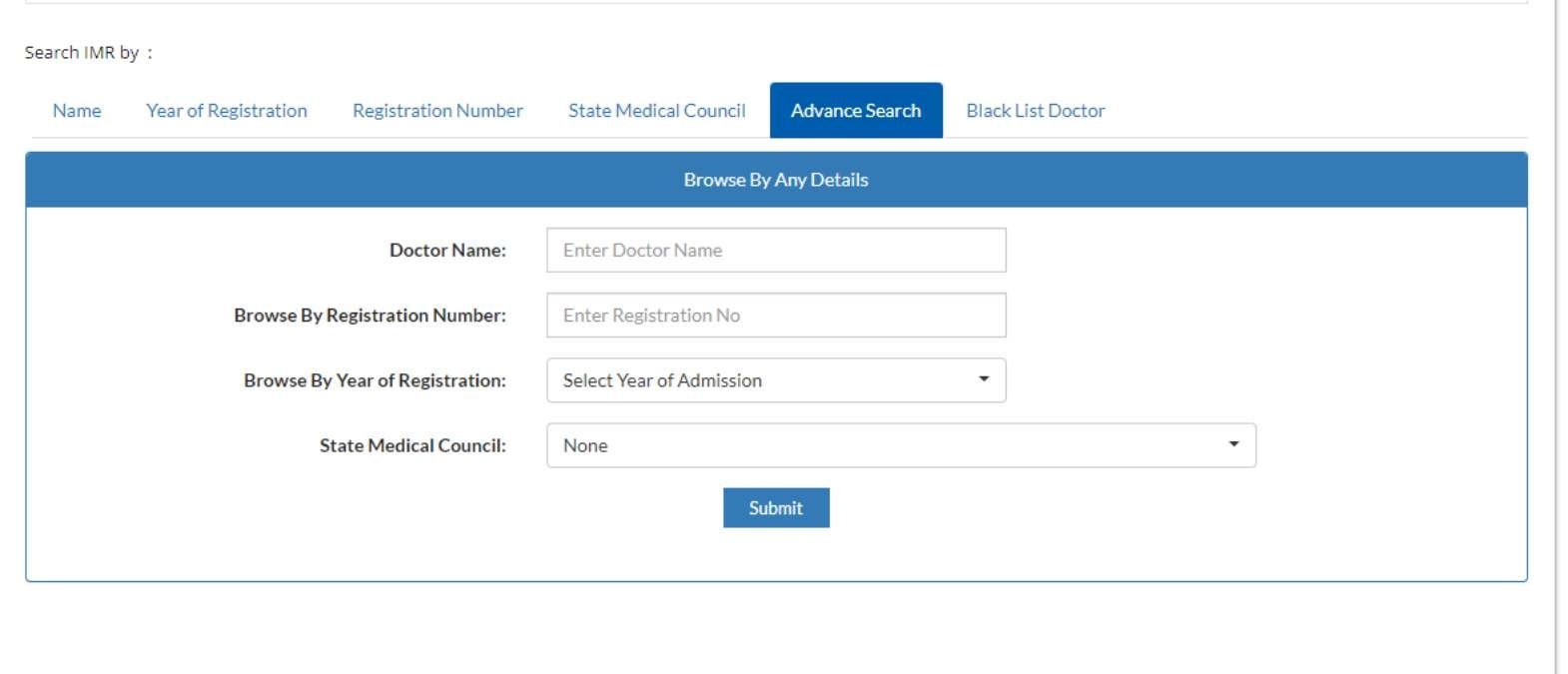 यहां नाम, ईयर ऑफ रजिस्ट्रेशन, रजिस्ट्रेशन नंबर, स्टेट मेडिकल काउंसिल, एडवांस सर्च, ब्लैक लिस्ट डॉक्टर ऑपशंस के जरिये सर्च कर सकते हैं.