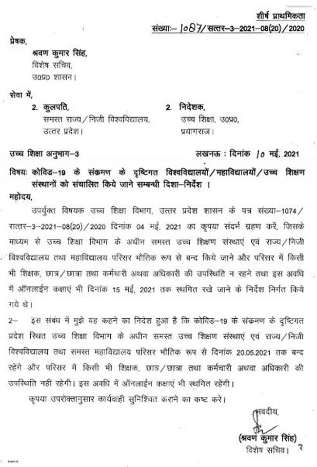 यूपी के उच्च शिक्षा विभाग के अधीन सभी शिक्षण संस्थानों को 20 मई तक बंद रखने का आदेश दिया है. राज्य सरकार के निर्देशानुसार उत्तर प्रदेश के सभी विश्वविद्यालय महाविद्यालय, राज्य/निजी विश्वविद्यालय और उच्च शिक्षण संस्थान 20 मई तक बंद रहेंगे.